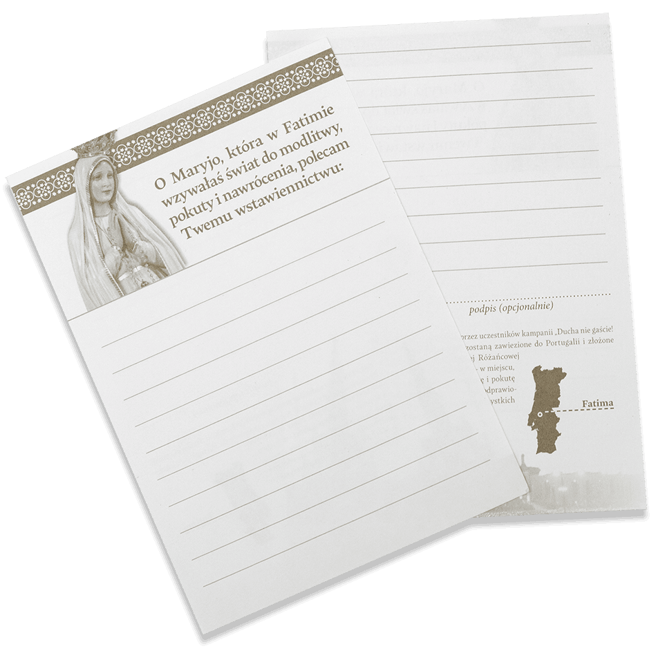 Do pakietu dołączona jest również karta, na której możesz zapisać swoje osobiste prośby i modlitwy i odesłać do nas. Wszystkie karty nadesłane przez uczestników kampanii zostaną zawiezione do Portugalii i złożone w Sanktuarium Matki Bożej Różańcowej w Fatimie, u stóp Niepokalanej – w miejscu, gdzie Maryja prosiła o modlitwę i pokutę za grzeszników.