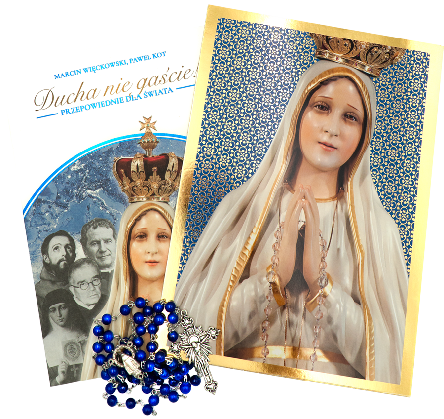 • poświęcony różaniec w barwach Maryjnych, pomocny w modlitwie, do której Matka Boża wielokrotnie wzywała w swoich objawieniach;